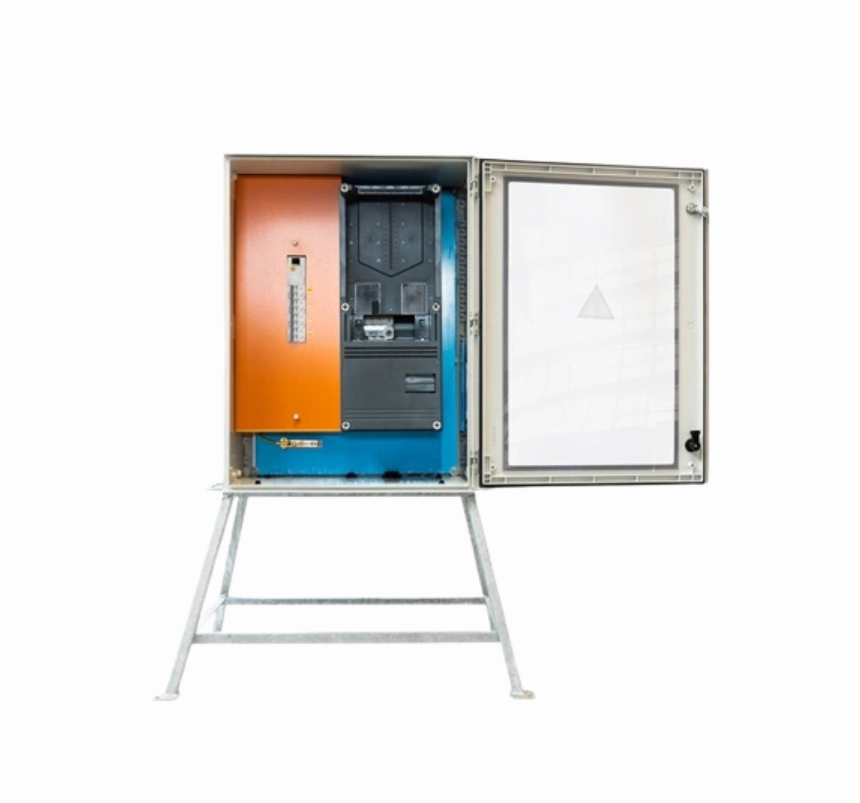 In het geval er nog geen vaste stroomaansluiting is op de werf, kan een monofasige werfkast geplaatst worden op de werf. Deze kast heeft 4 huishoudelijke stekkers om kleine apparatuur aan te hangen.